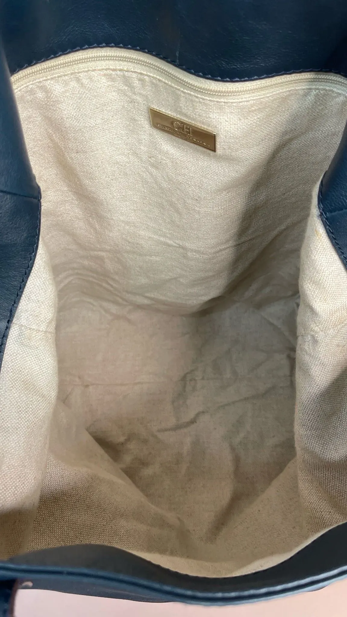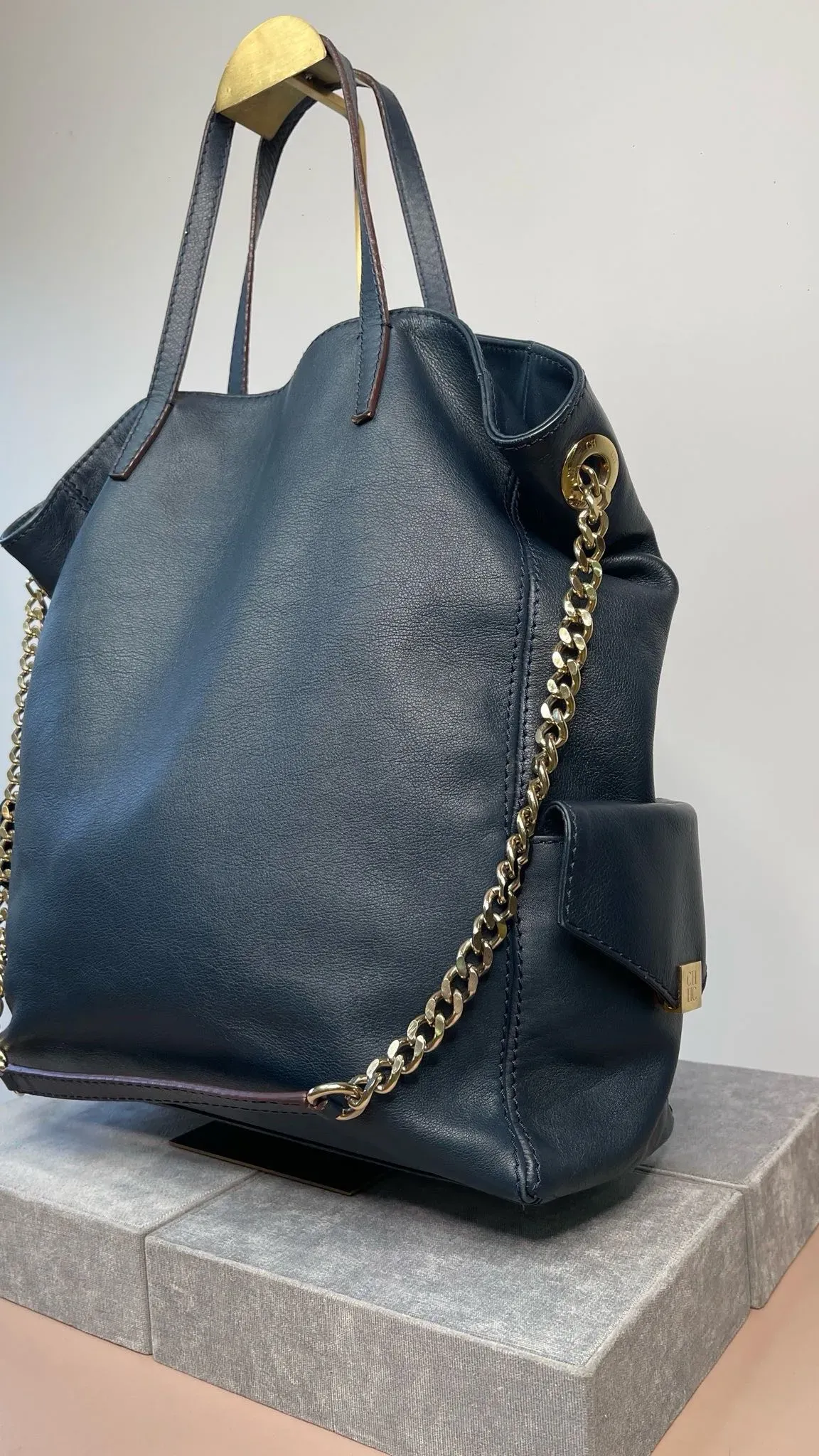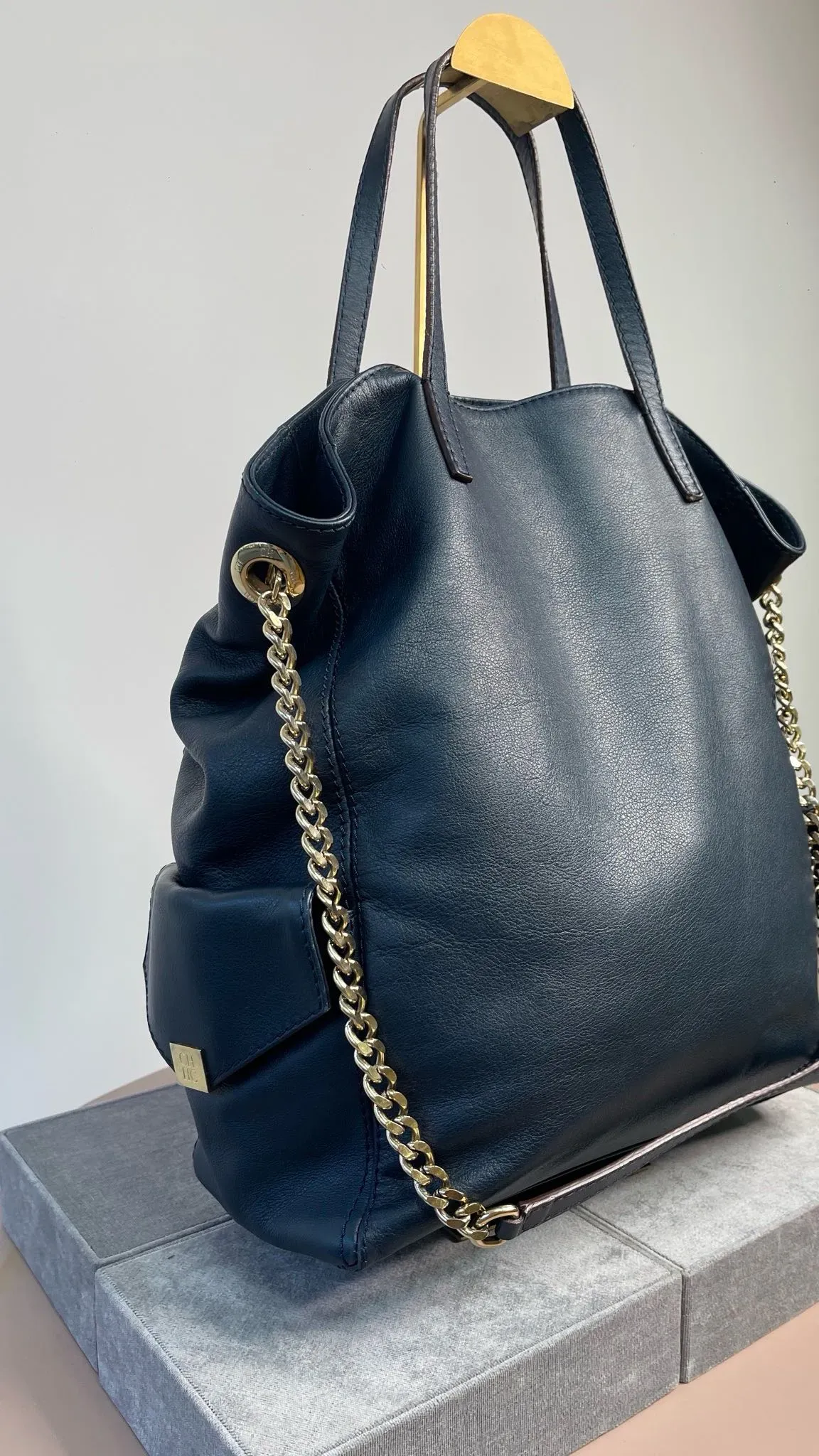 Carolina Herrera Navy Blue Leather Encelope Pocket Tote.