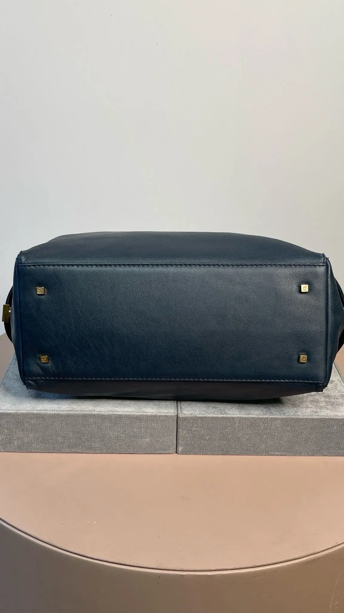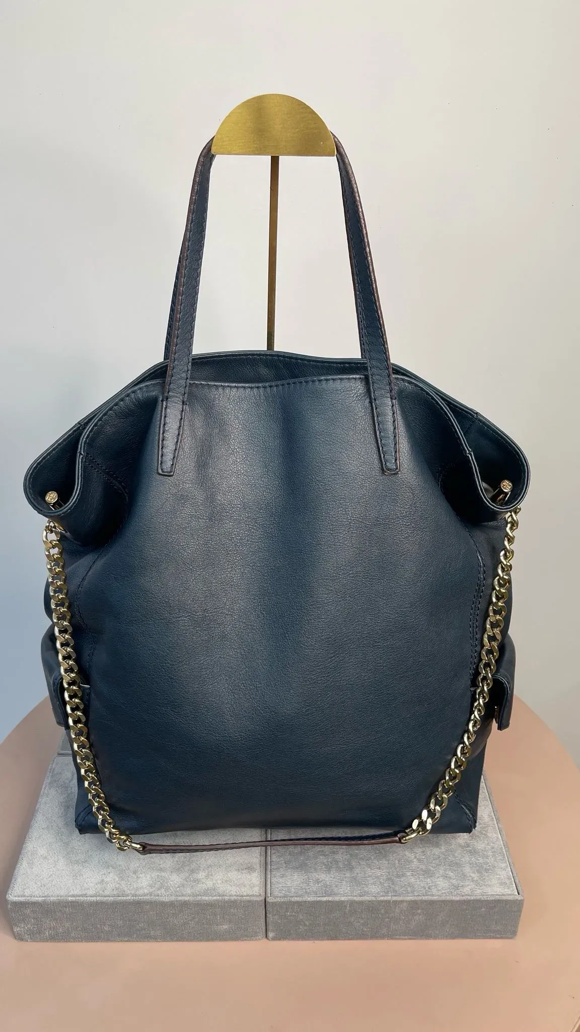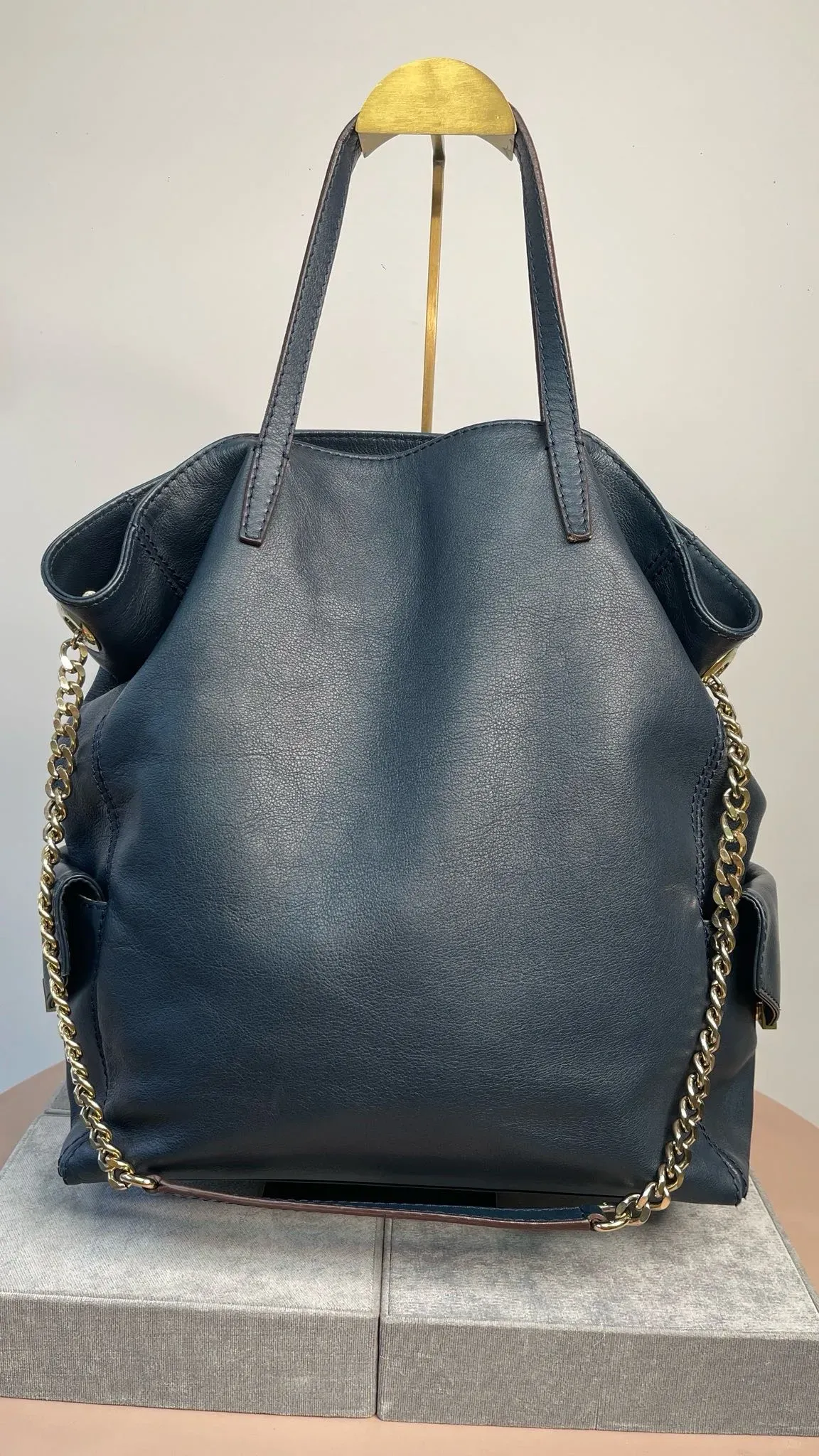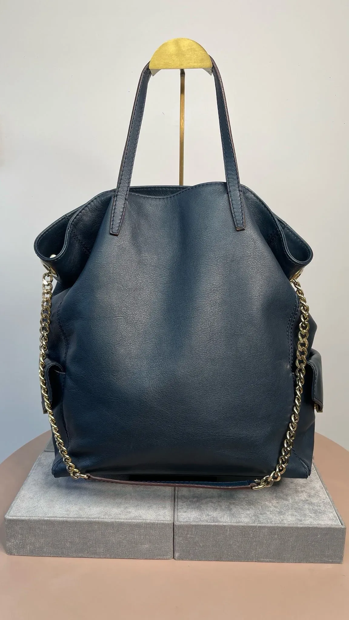Carolina Herrera Navy Blue Leather Encelope Pocket Tote.