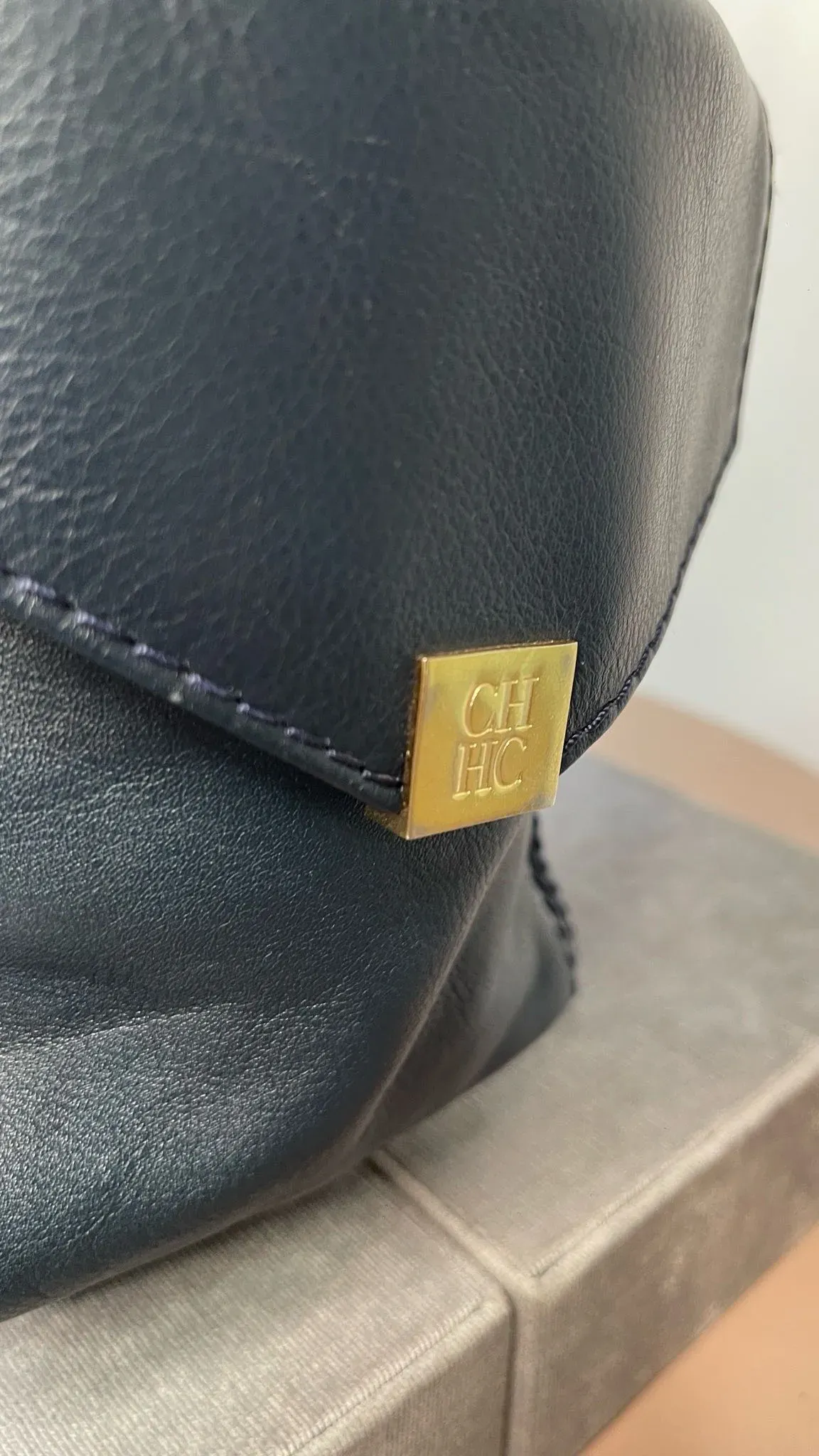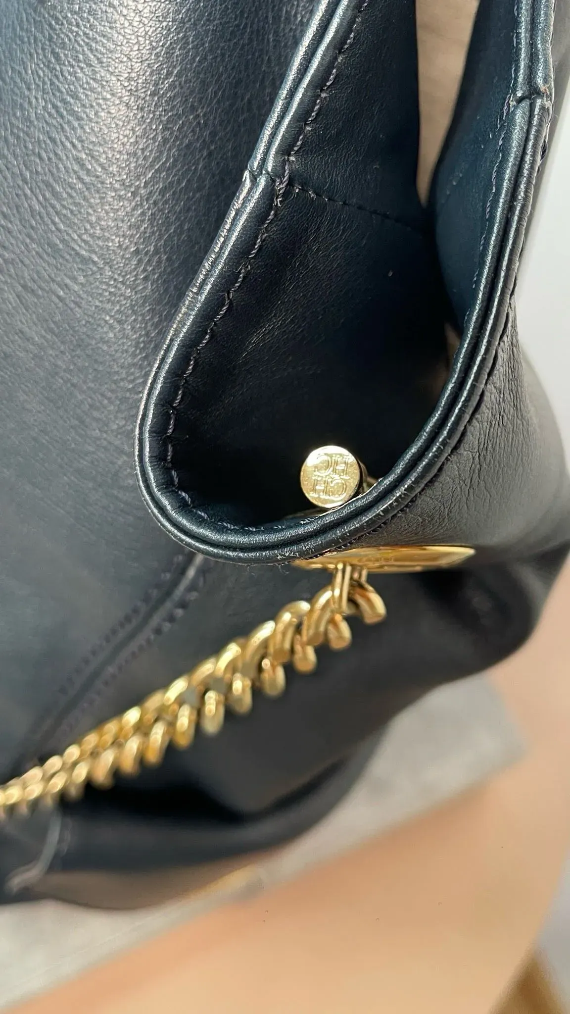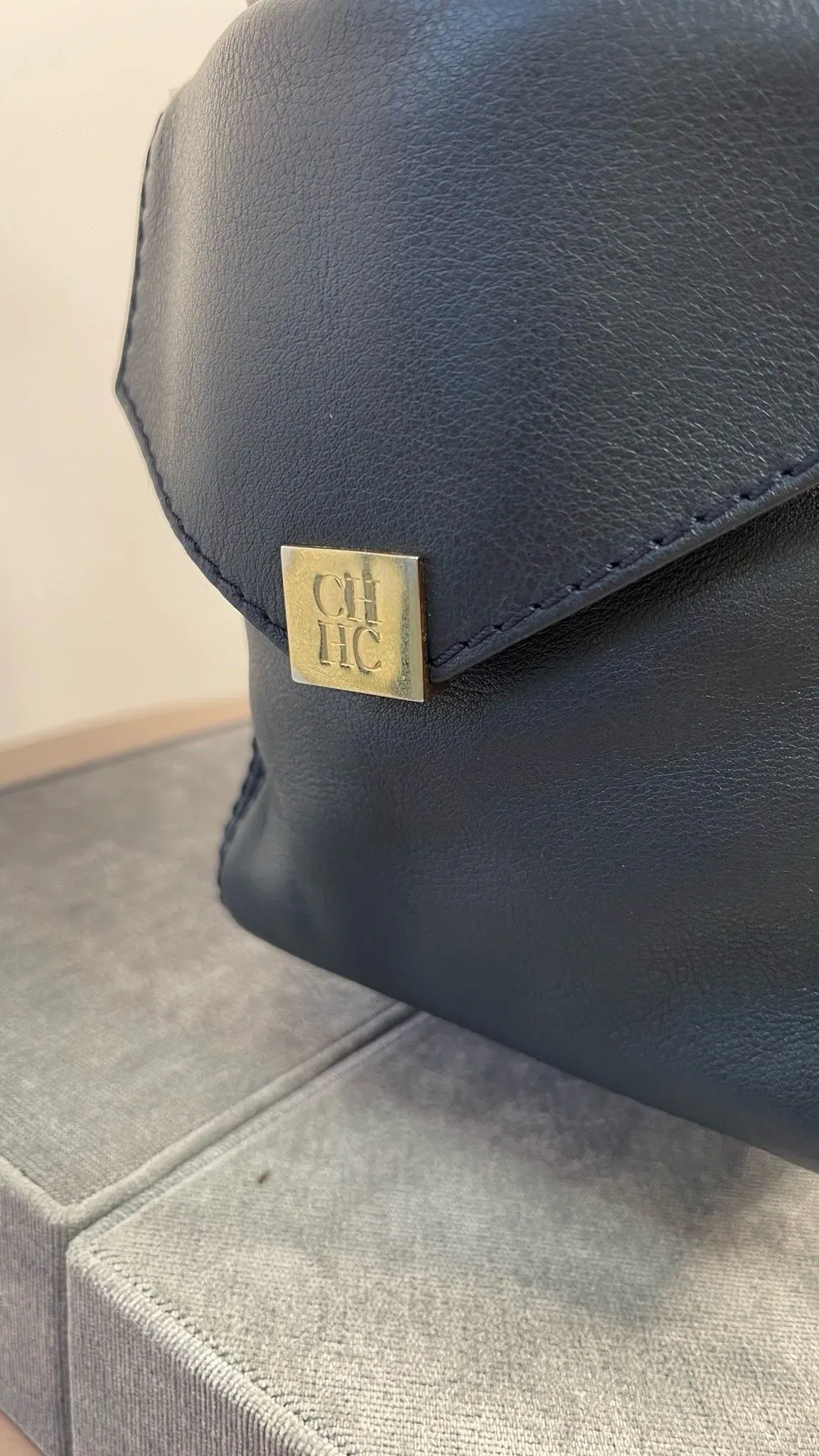 Bolso de cuero azul marino Carolina Herrera con bolsillo tipo sobre, ideal para llevar tus pertenencias con estilo y elegancia. Perfecto para cualquier ocasión, este bolso es una combinación perfecta de funcionalidad y moda.