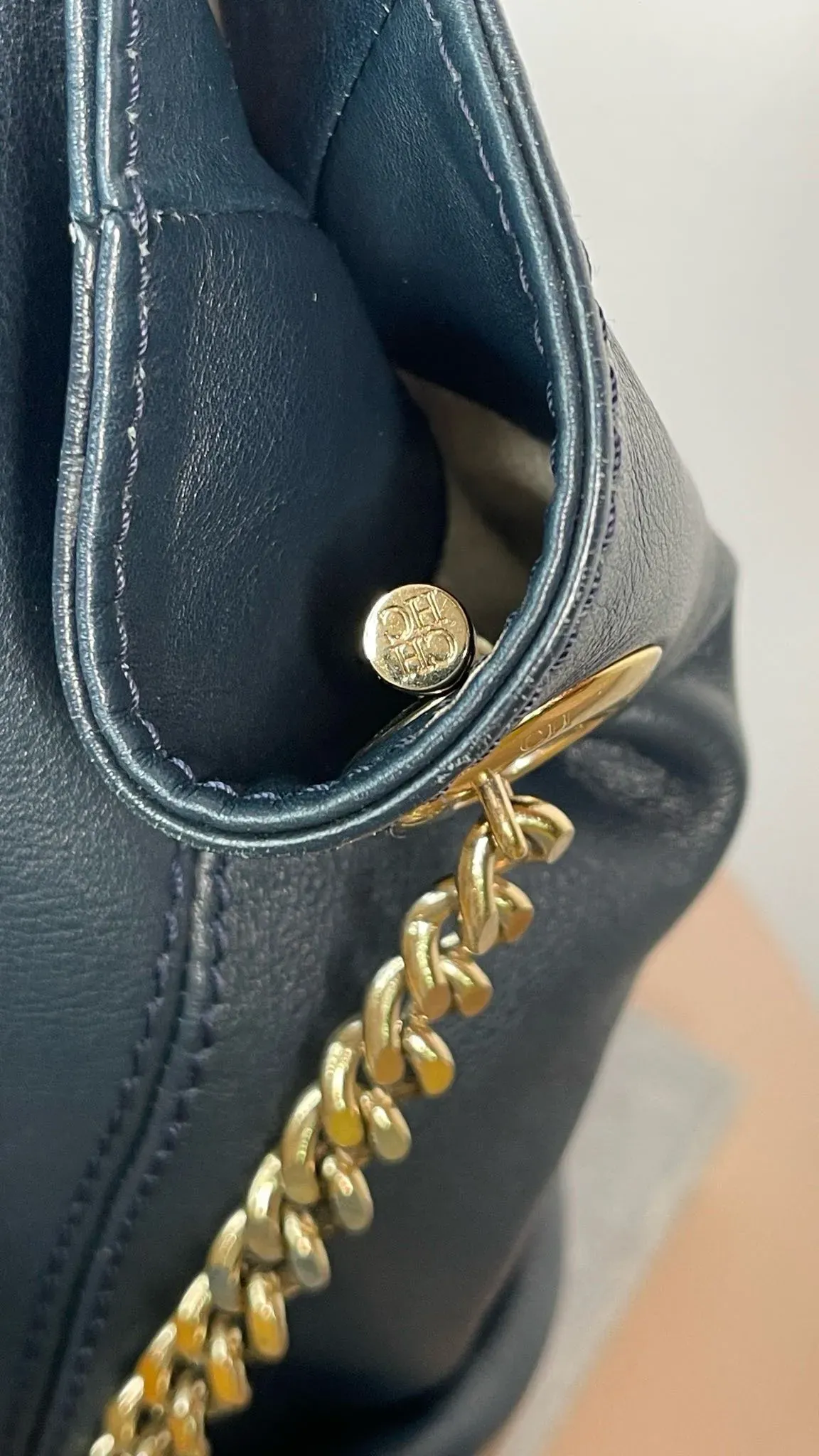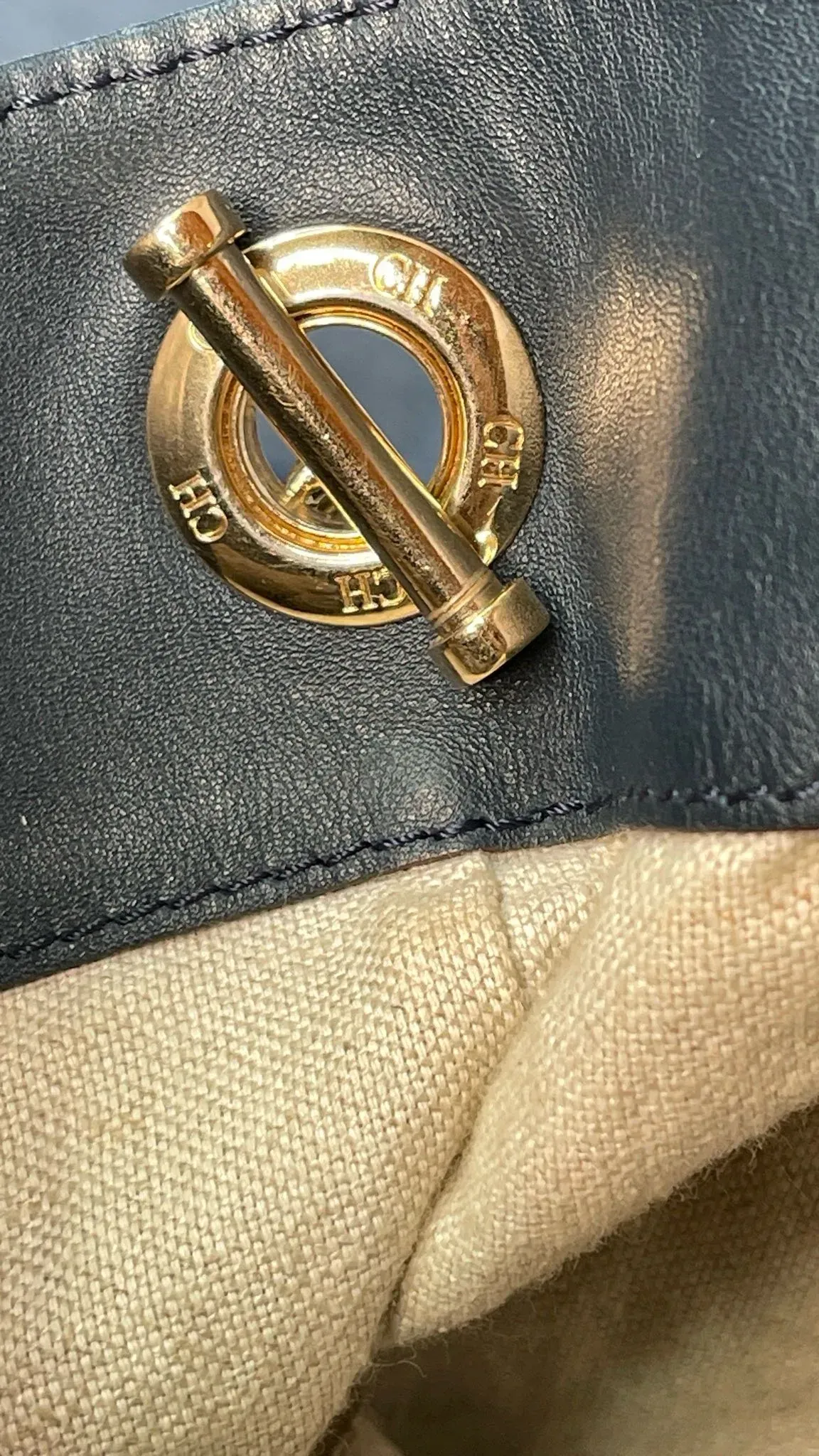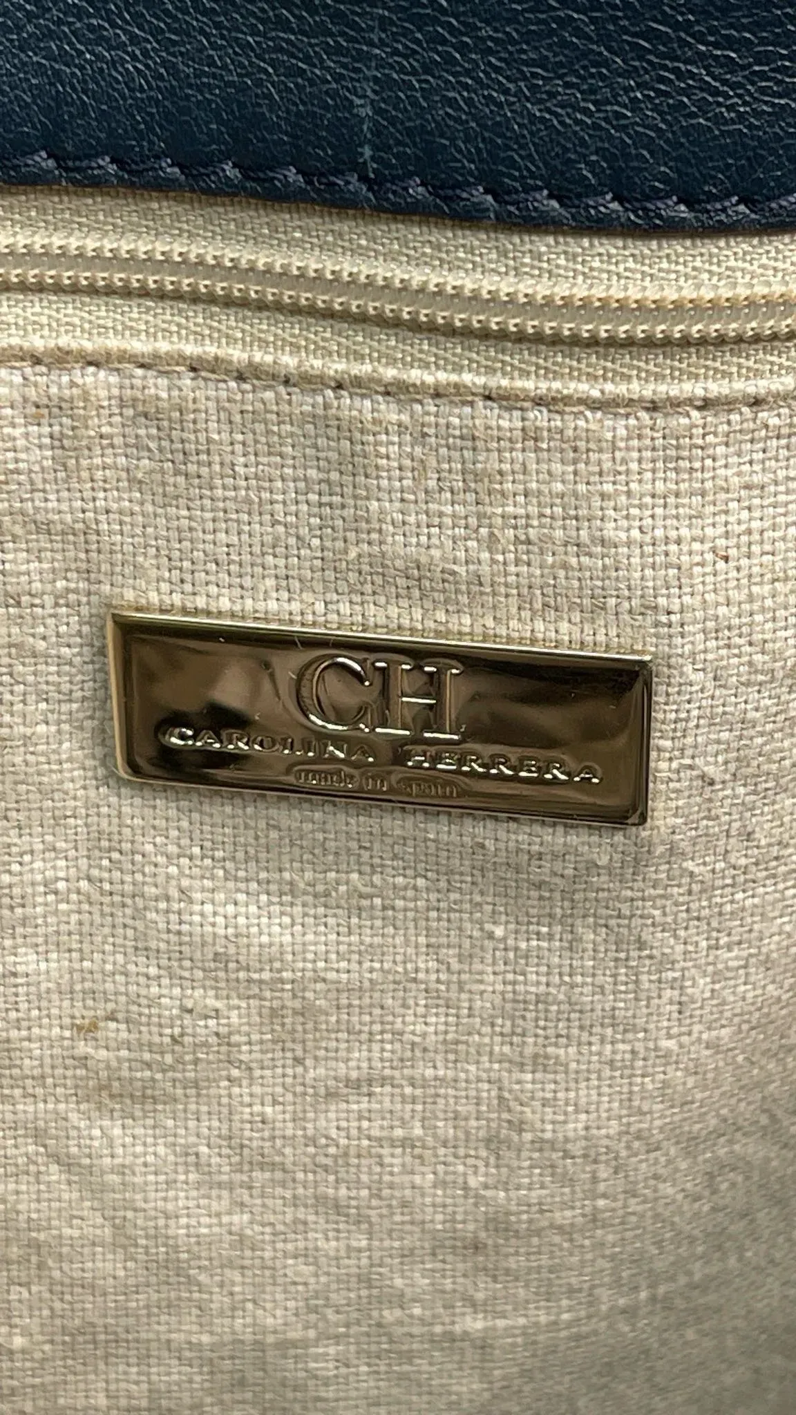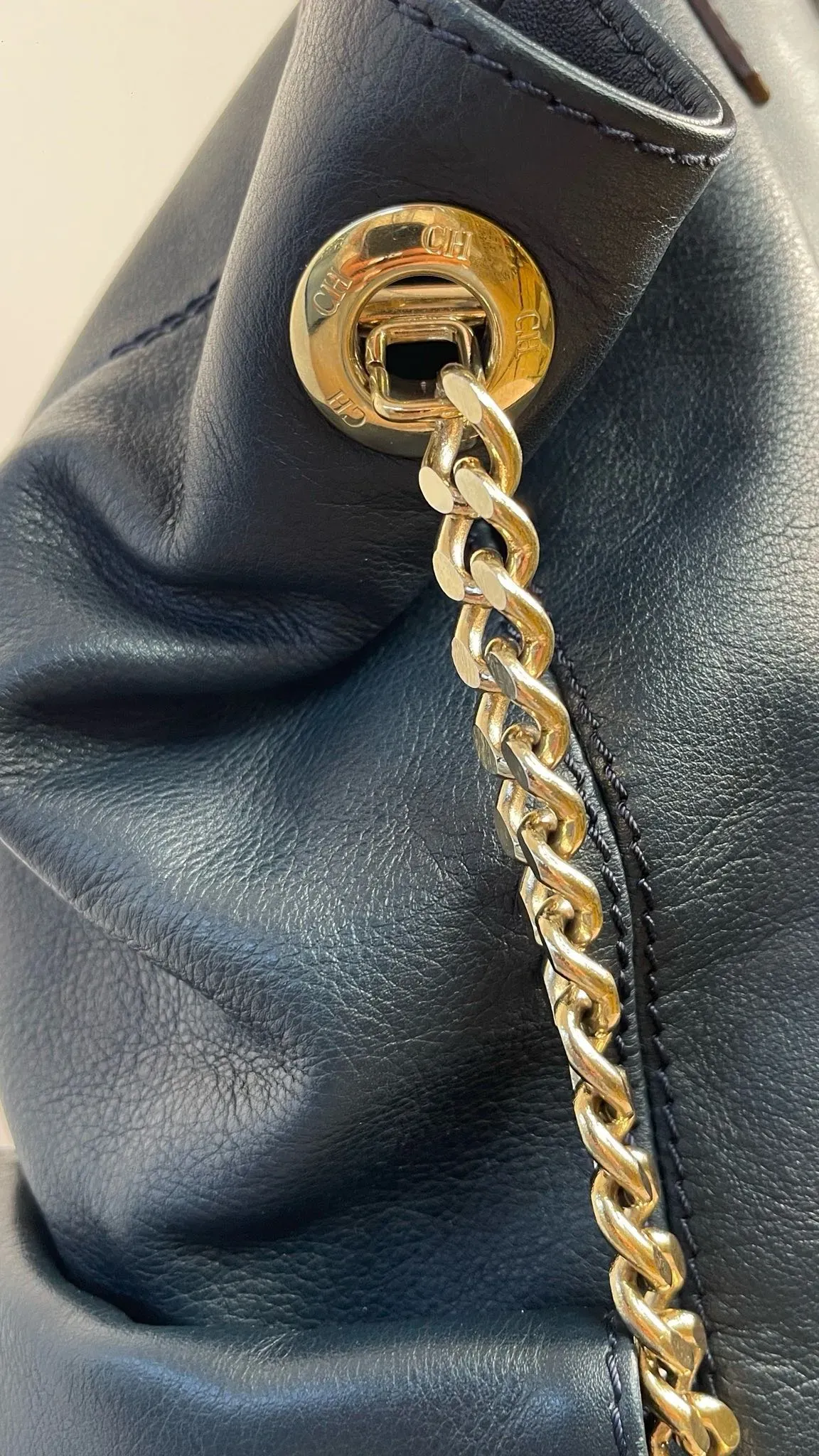 Bolso de cuero azul marino Carolina Herrera con bolsillo tipo sobre, ideal para llevar tus pertenencias con estilo y elegancia. Perfecto para cualquier ocasión, este bolso es una combinación perfecta de funcionalidad y moda.