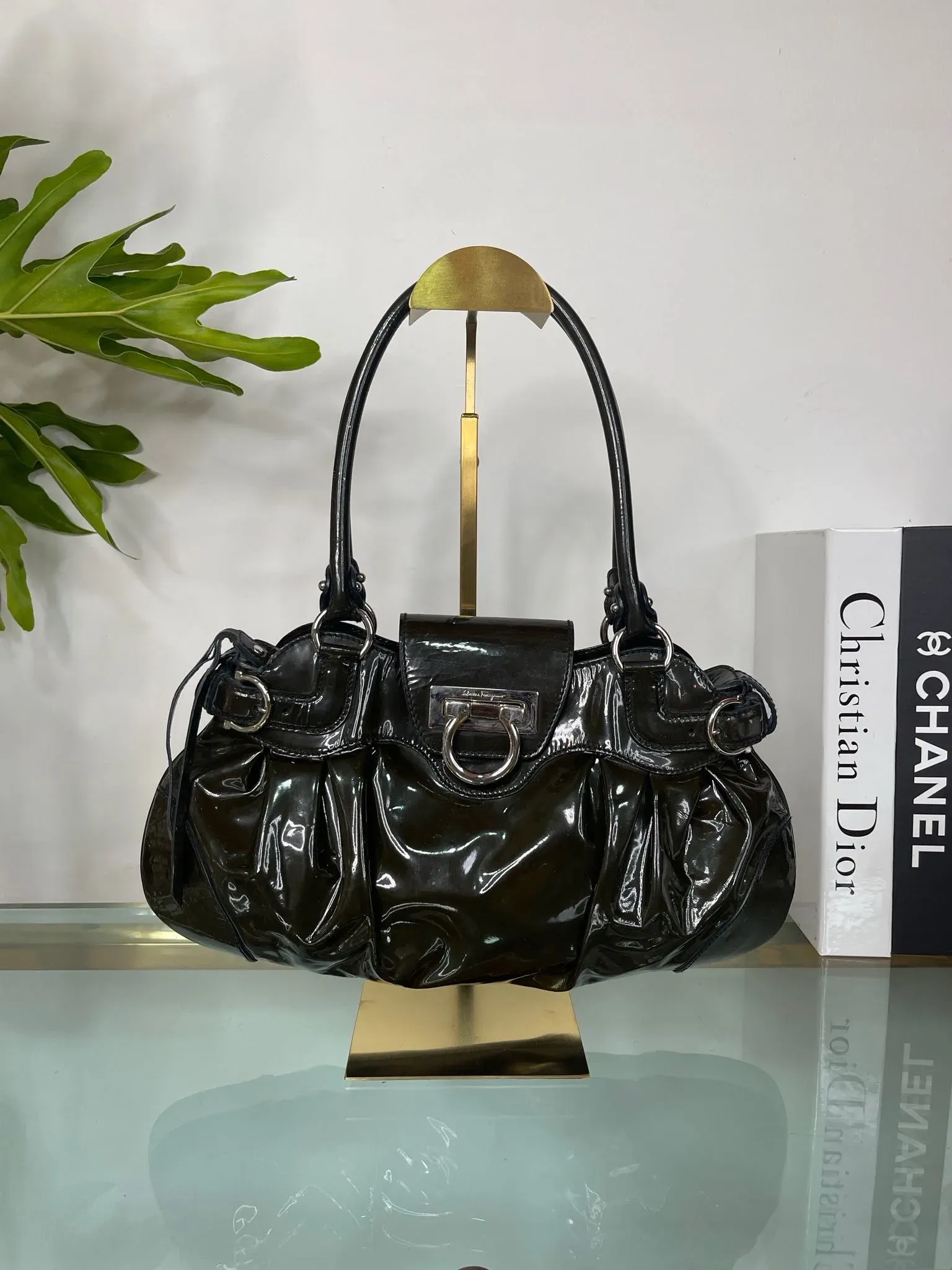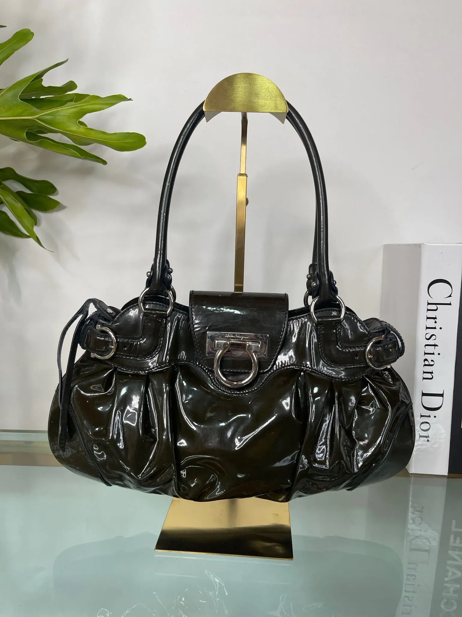 Cartera de hombro de cuero charol Salvatorre Ferragamo, elegante y sofisticada. Perfecta para complementar cualquier outfit con estilo y distinción. Ideal para llevar tus pertenencias con clase y glamour en cualquier ocasión.