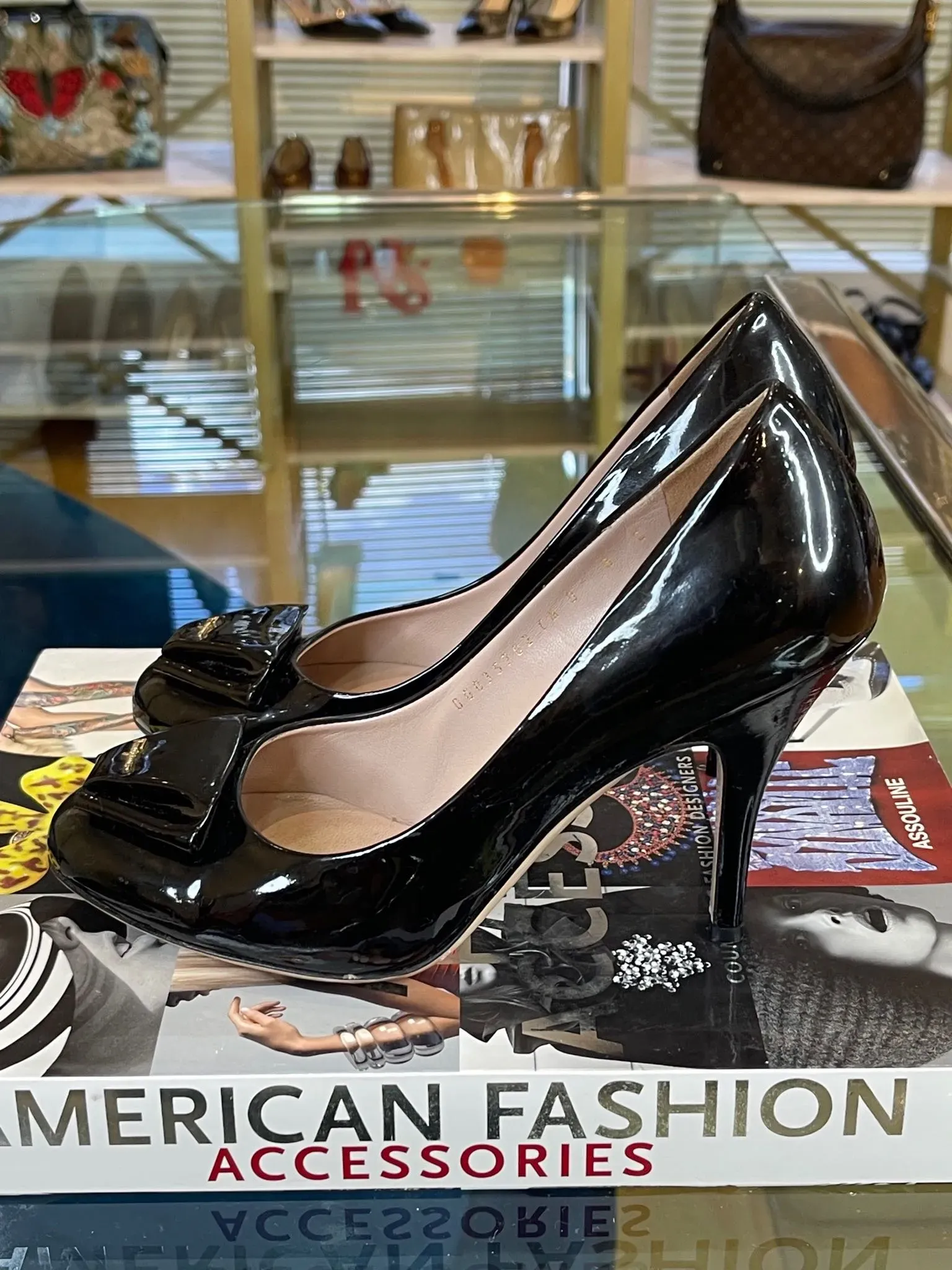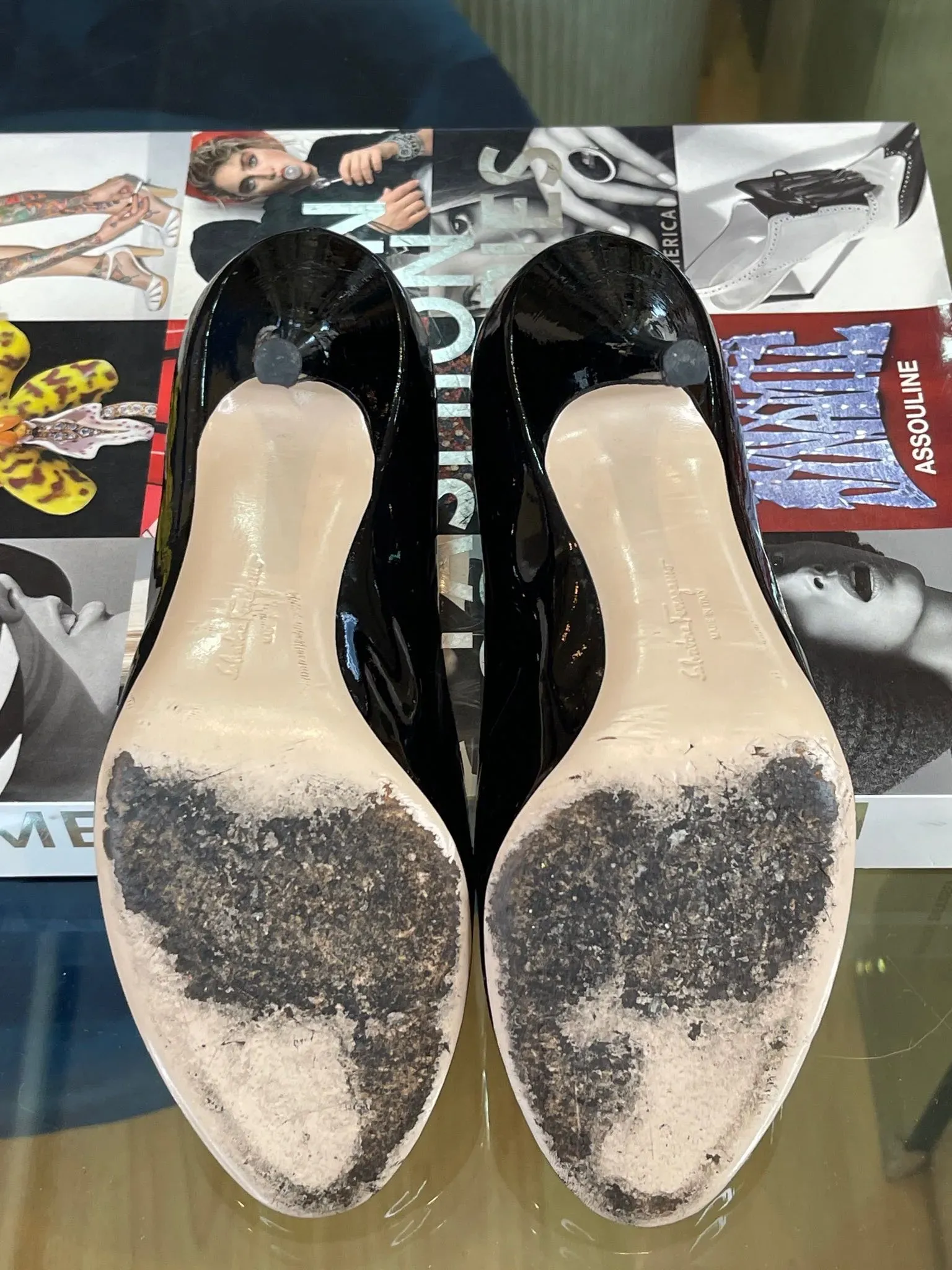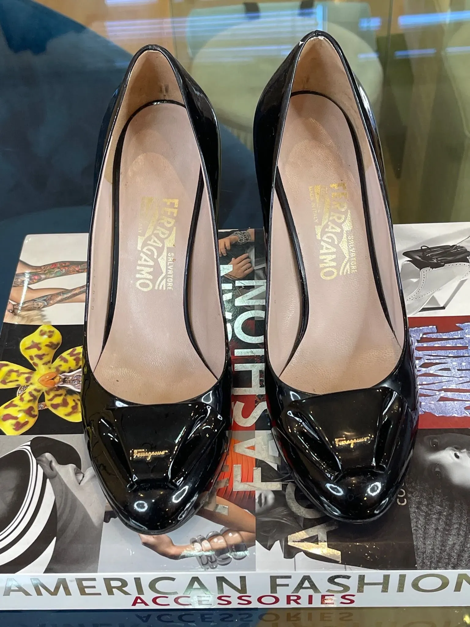 Estos elegantes zapatos de tacón Ferragamo Vera con detalle de lazo en charol son el complemento perfecto para cualquier ocasión. Con un diseño sofisticado y femenino, estos zapatos Talla 38 son ideales para lucir con estilo y elegancia en Venezuela.